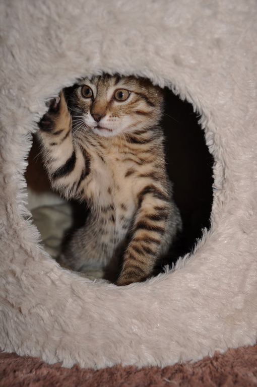 Алекс - Помесь бенгальца с британцем. Возраст 1.5 месяца. Вес целый кг. О характере пока сказать ничего не могу, так как за несколько дней нахождения у нас его проявил не полностью (много времени уходит на сон). Единственное по-детски любопытен и бесстрашен. К тому же, одним своим появлением заставил меня переписать текст сайта и дополнить его характеристику, что само по себе является подвигом