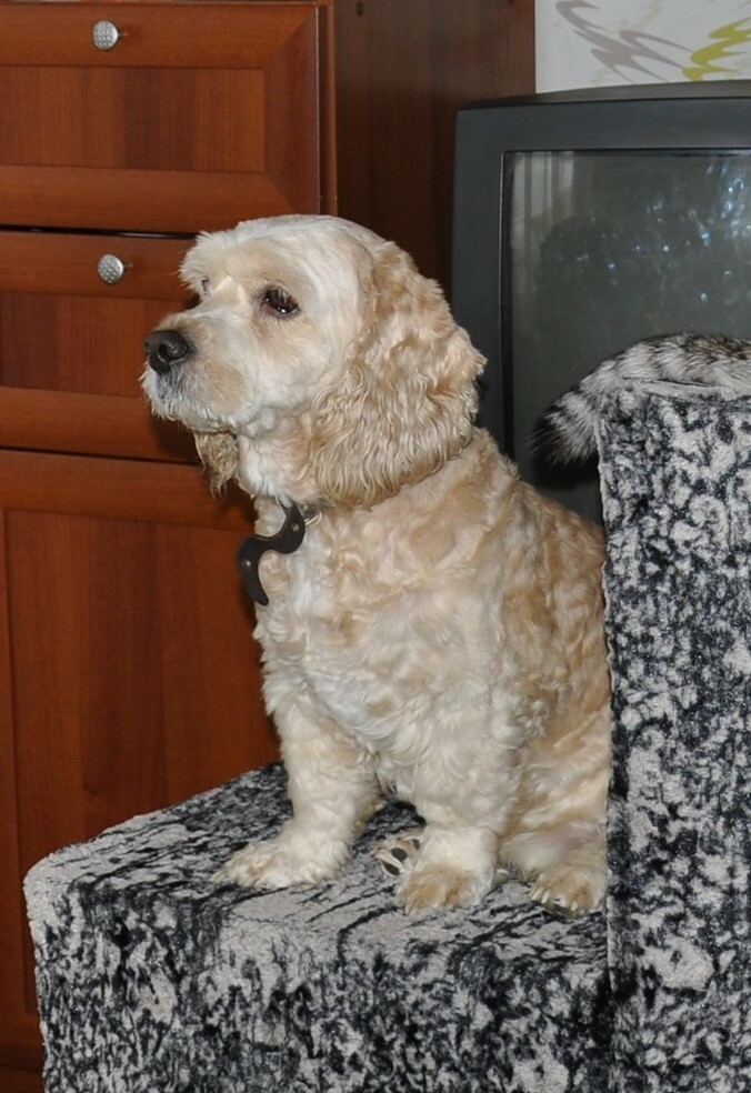 Ну и Себик, собственной персоны – возраст 13лет, вес 14кг. Кокер спаниель в самом расцвете сил. Искренне считает себя котом, особенно в те моменты, когда ест из их миски. Лает правду в глаза, отчего и страдает (шутка). Жаден. Ради еды готов на все. Не женат, (почти)))). Общителен. Любит людей. А кормящих его людей любит еще больше. Пытается любить… всех вокруг, но не всем это по душе.